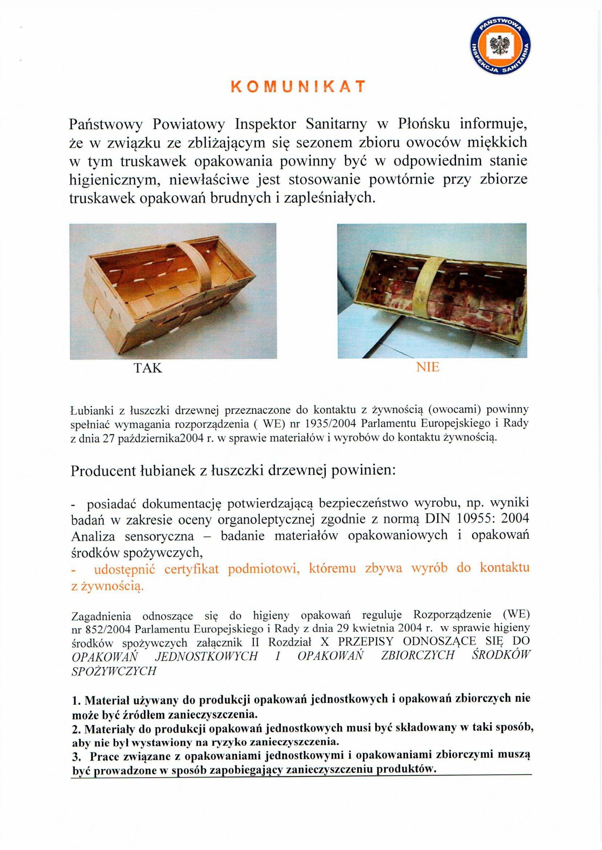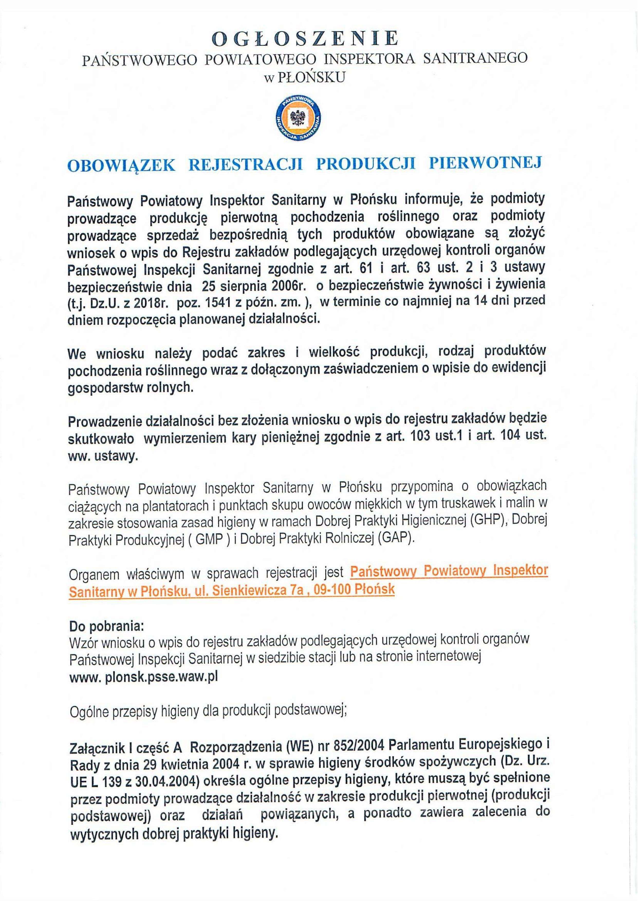 Państwowy Powiatowy Inspektor Sanitarny w Płońsku przypomina o obowiązku rejestracji produkcji pierwotnej. W związku ze zbliżającym się sezonem zbioru owoców miękkich PPIS zwraca uwagę na jakość stosowanych powtórnie opakowań przy zbiorach i informuje o możliwości skażenia owoców norowirusami.