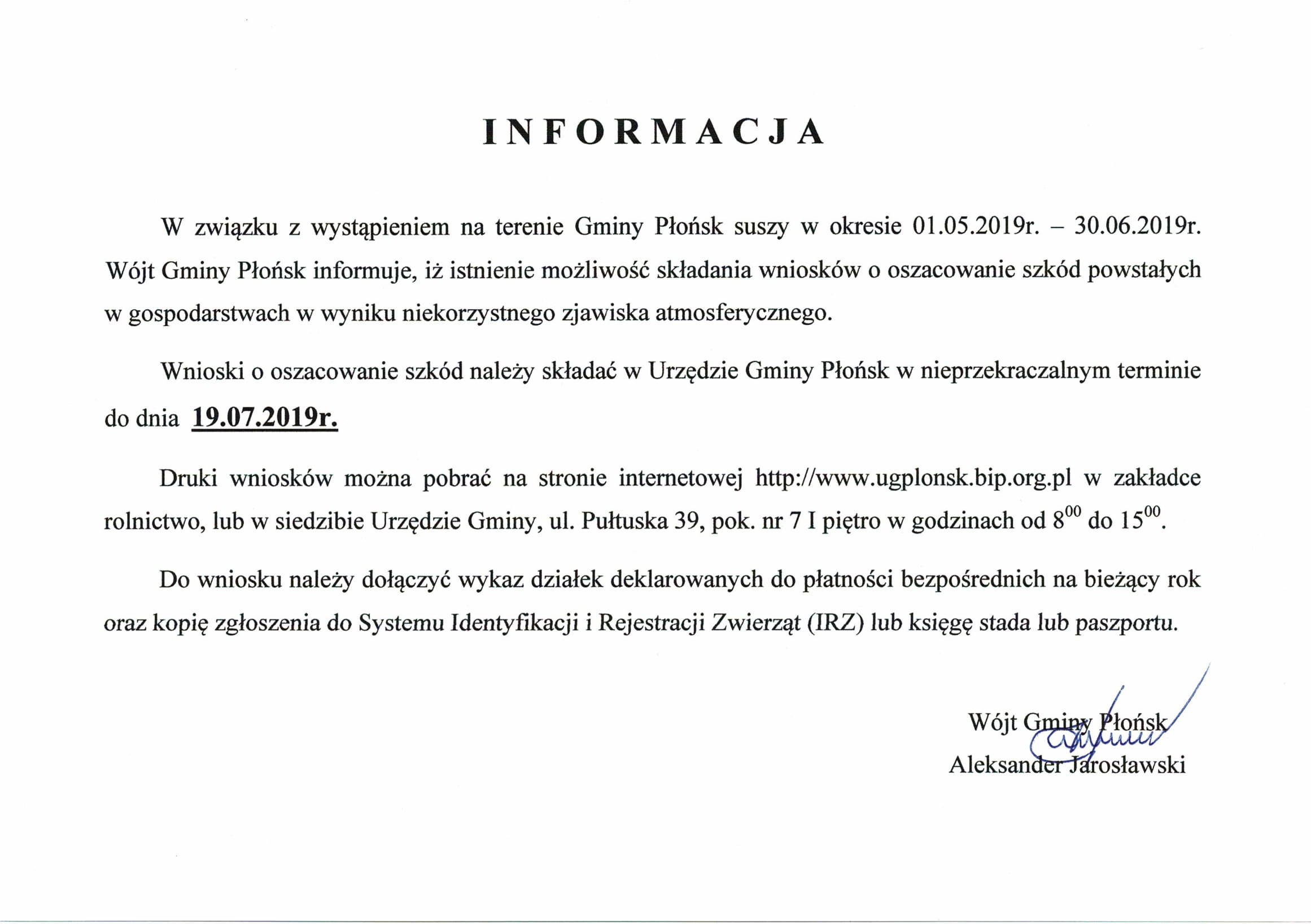 Wnioski o oszacowanie szkód należy składać w Urzędzie Gminy Płońsk w nieprzekraczalnym terminie do dnia 19.07.2019r.