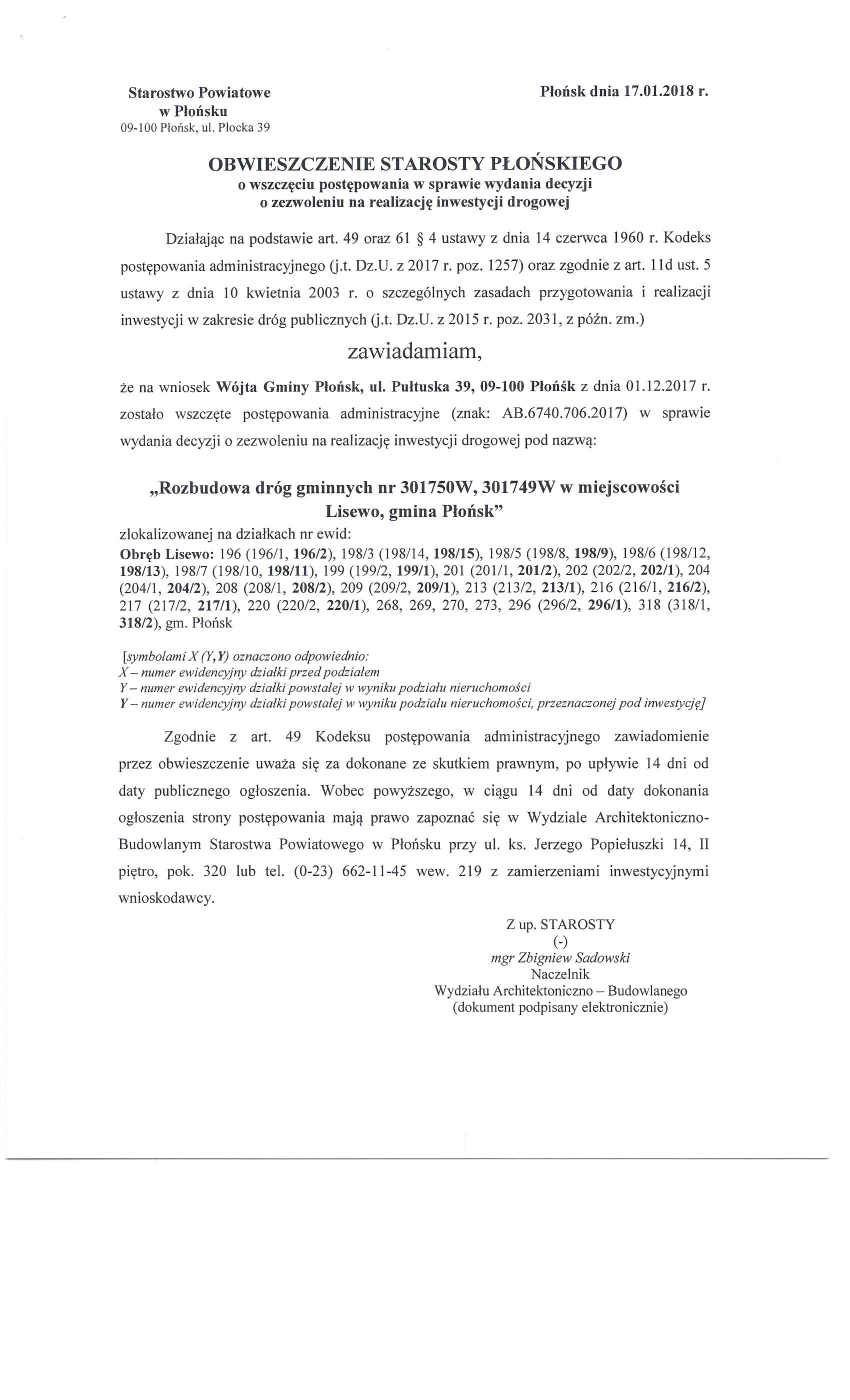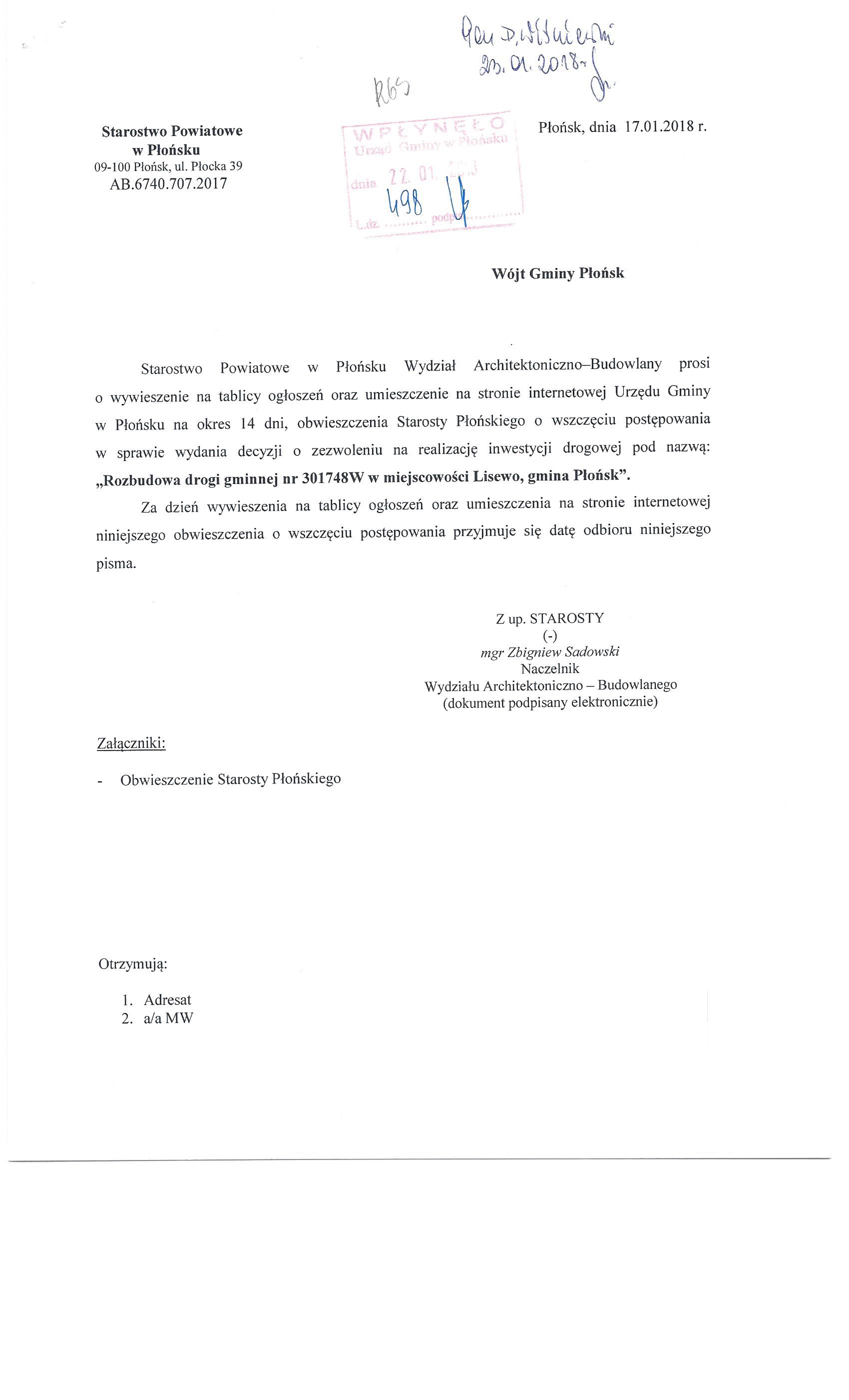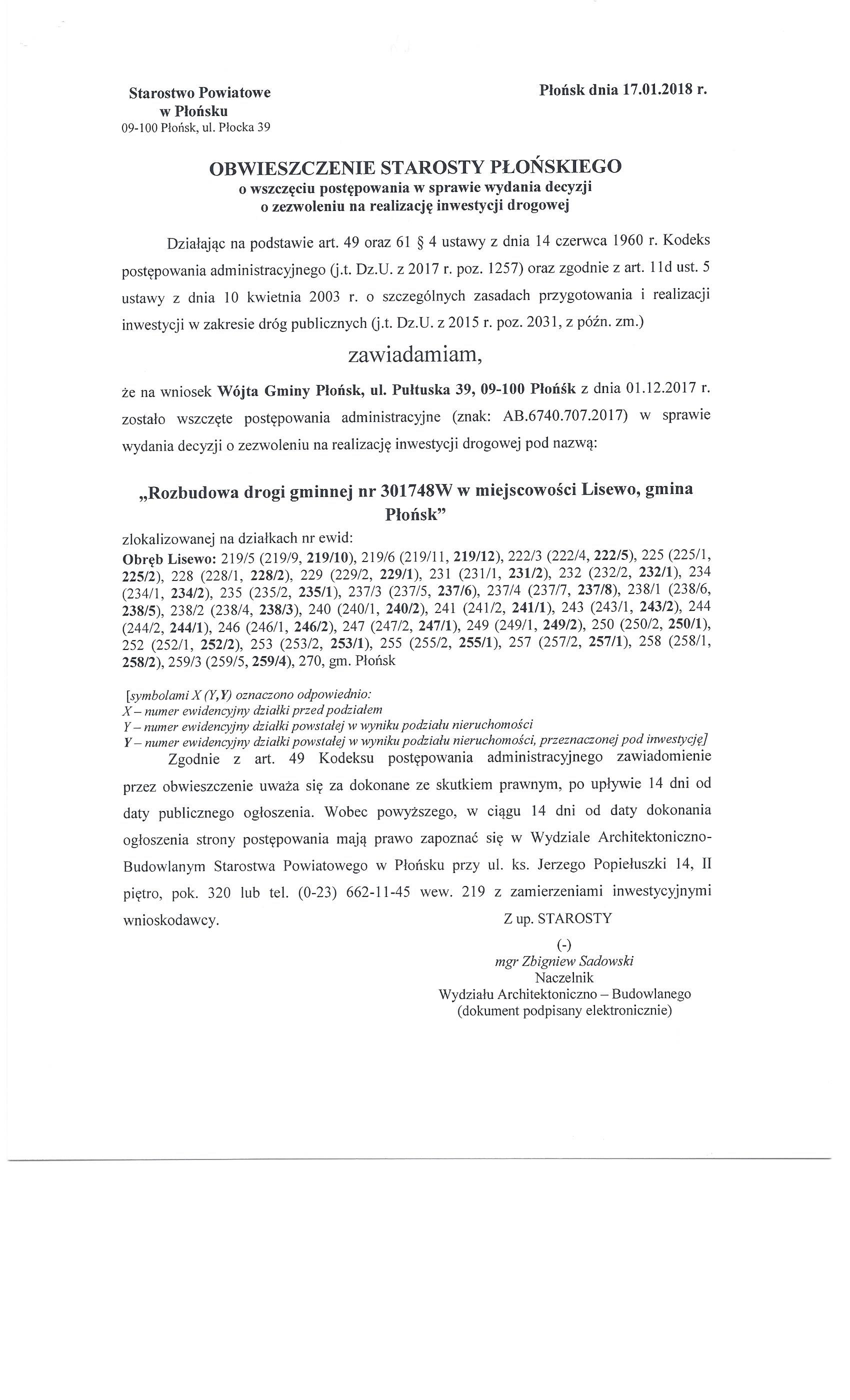 Starostwo Powiatowe w Płońsku Wydział Architektoniczno-Budowlany prosi o wywieszenie na tablicy ogłoszeń oraz umieszczenie na stronie internetowej Urzędu Gminy w Płońsku na okres 14 dni, obwieszczenia Starosty Płońskiego o wszczęciu postępowania w sprawie wydania decyzji o zezwoleniu na realizację inwestycji drogowej pod nazwą: „Rozbudowa drogi gminnej w miejscowości Lisewo, gmina Płońsk”.