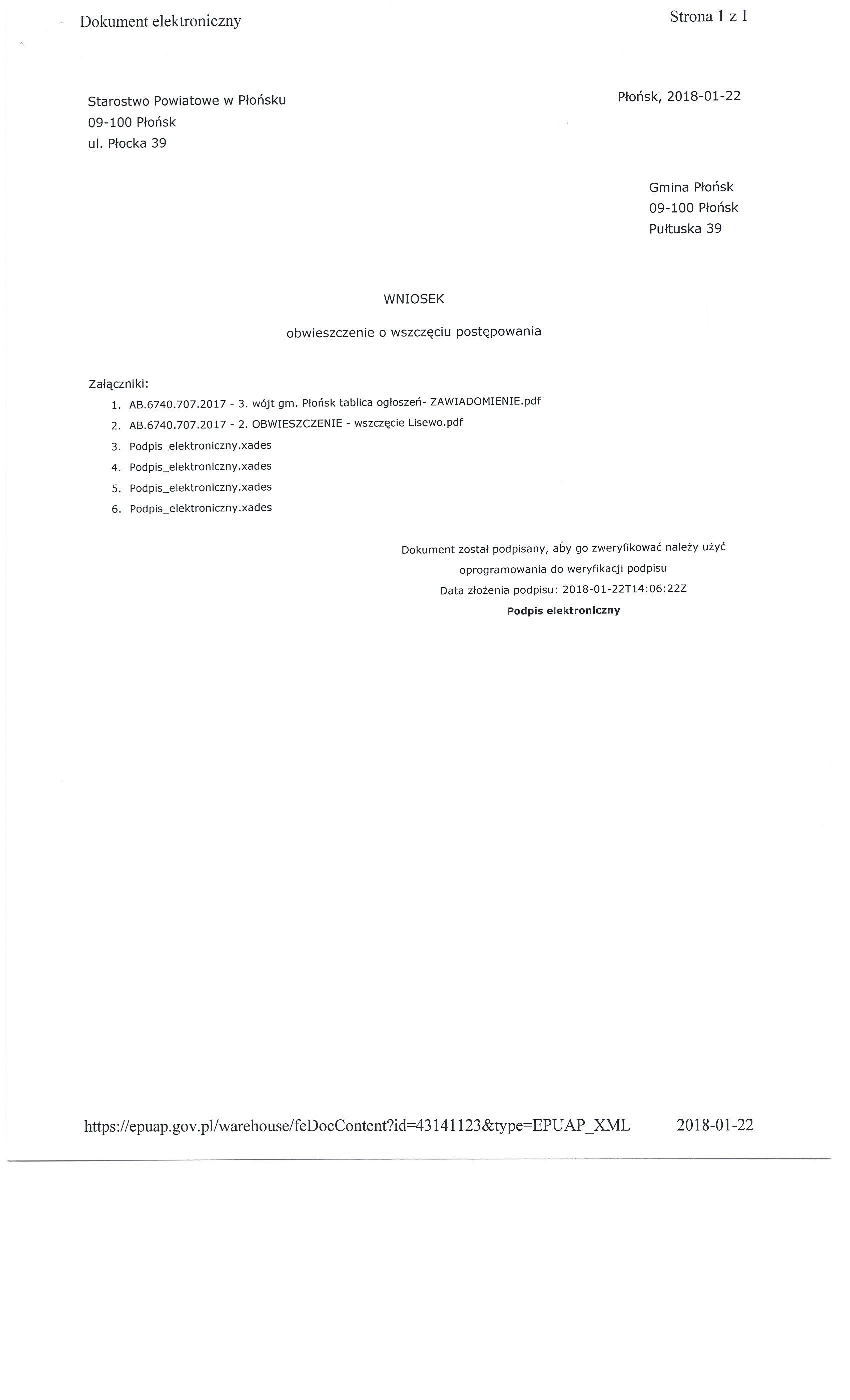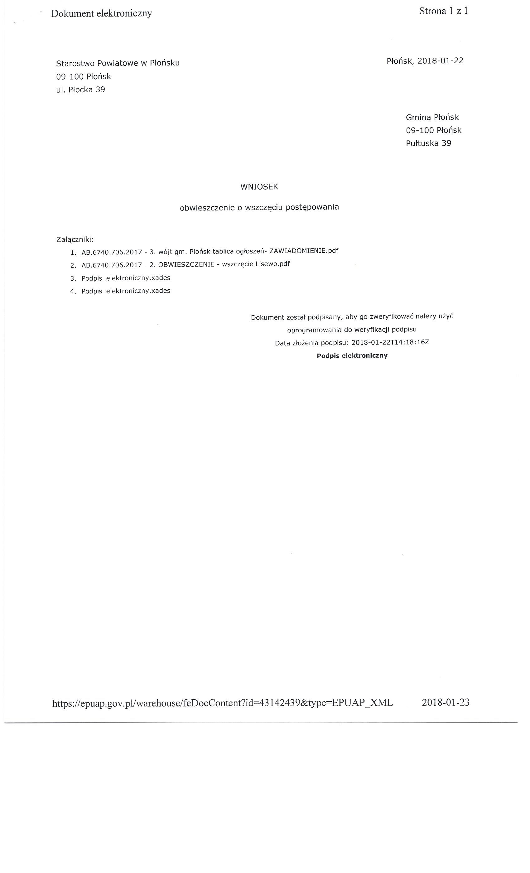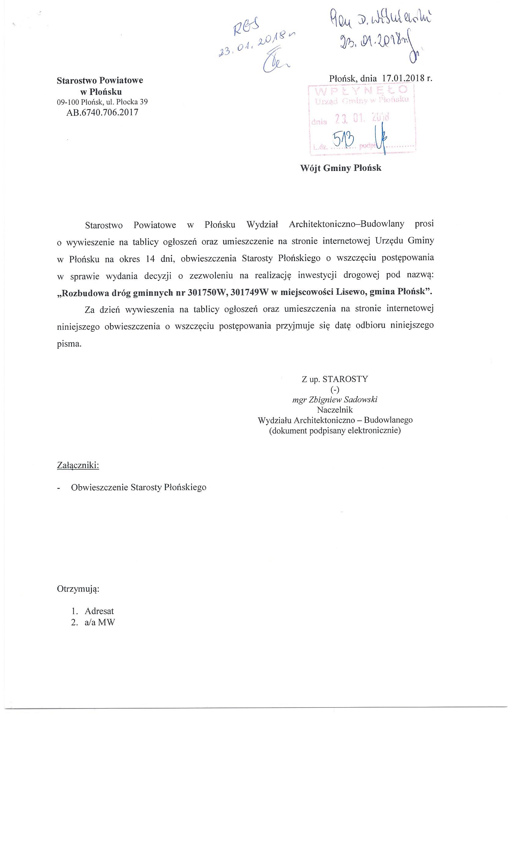 Starostwo Powiatowe w Płońsku Wydział Architektoniczno-Budowlany prosi o wywieszenie na tablicy ogłoszeń oraz umieszczenie na stronie internetowej Urzędu Gminy w Płońsku na okres 14 dni, obwieszczenia Starosty Płońskiego o wszczęciu postępowania w sprawie wydania decyzji o zezwoleniu na realizację inwestycji drogowej pod nazwą: „Rozbudowa drogi gminnej w miejscowości Lisewo, gmina Płońsk”.