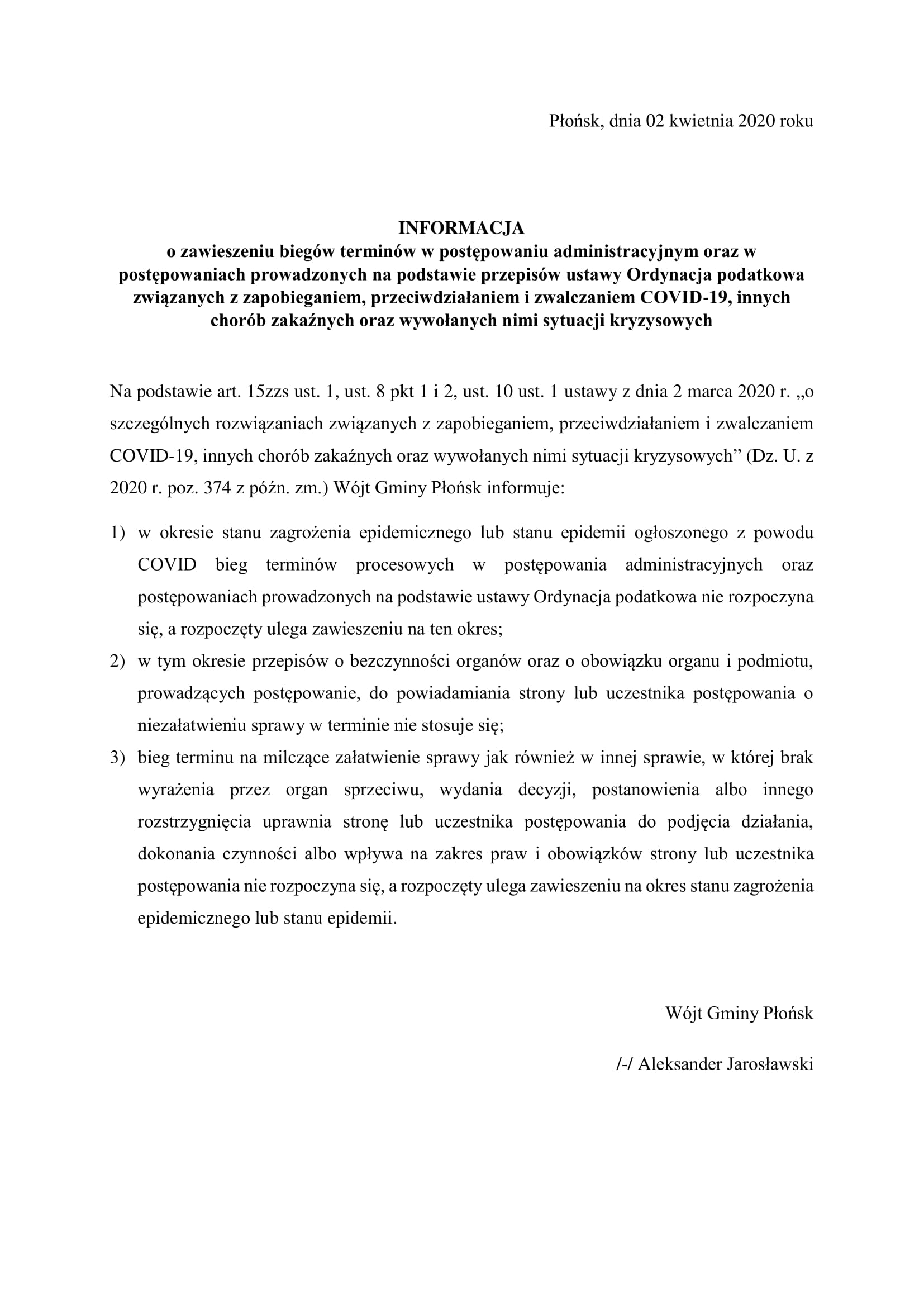 o zawieszeniu biegów terminów w postępowaniu administracyjnym oraz w postępowaniach prowadzonych na podstawie przepisów ustawy Ordynacja podatkowa związanych z zapobieganiem, przeciwdziałaniem i zwalczaniem COVID-19, innych chorób zakaźnych oraz wywołanych nimi sytuacji kryzysowych