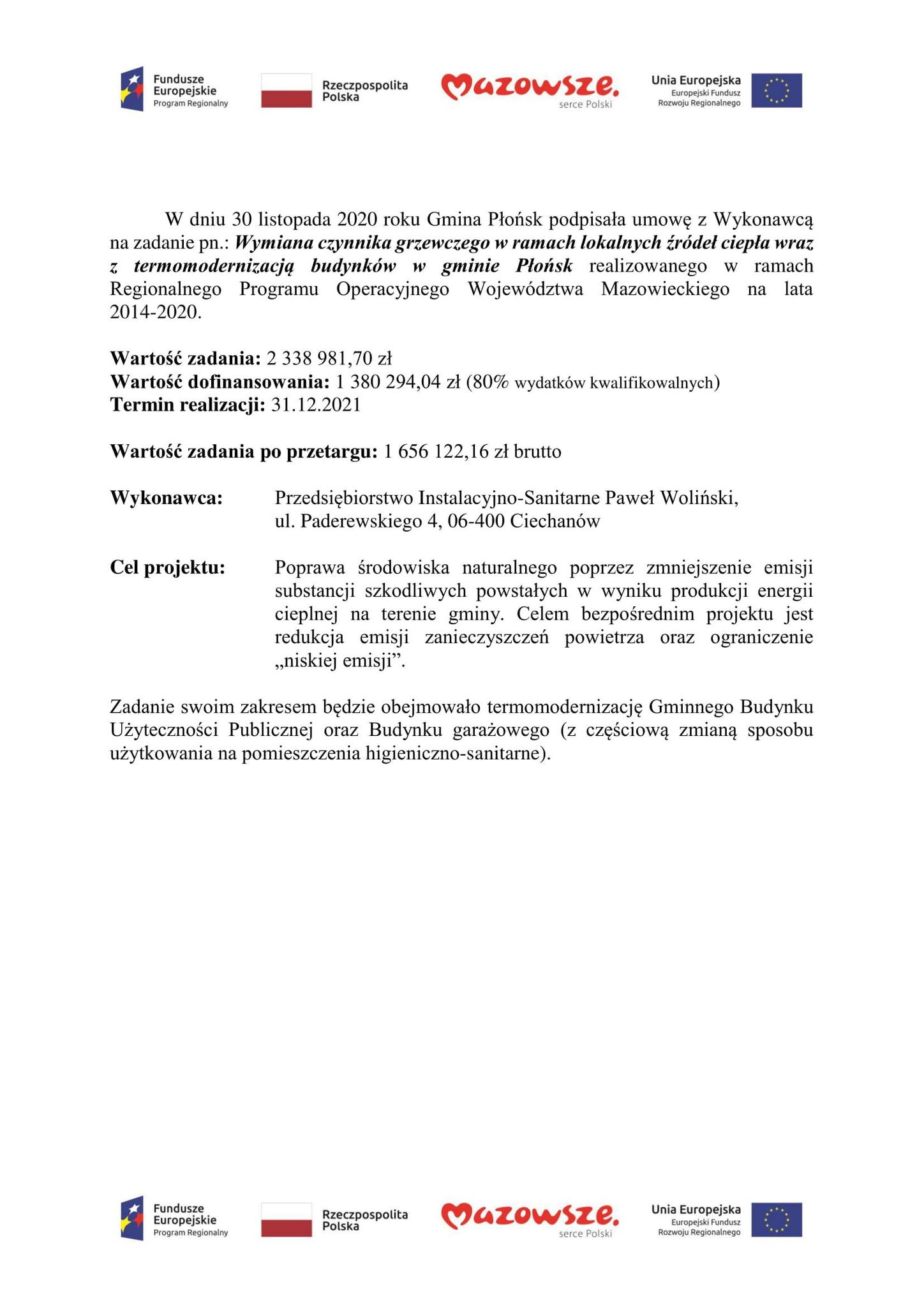 W dniu 30 listopada 2020 roku Gmina Płońsk podpisała umowę z Wykonawcą na zadanie pn.: Wymiana czynnika grzewczego w ramach lokalnych źródeł ciepła wraz z termomodernizacją budynków w gminie Płońsk realizowanego w ramach Regionalnego Programu Operacyjnego Województwa Mazowieckiego na lata 2014-2020.