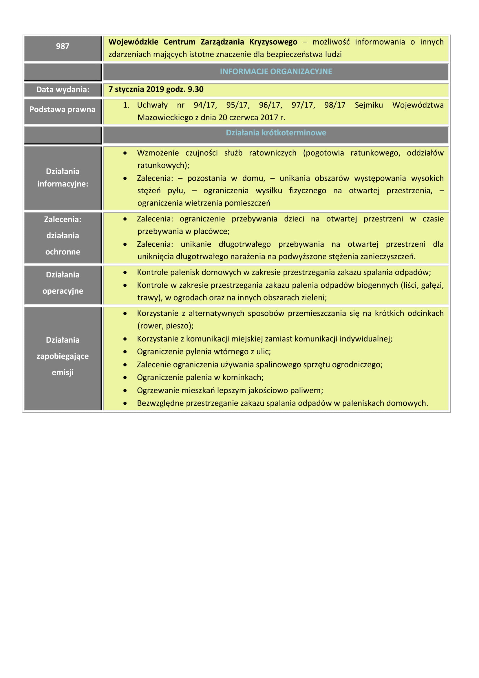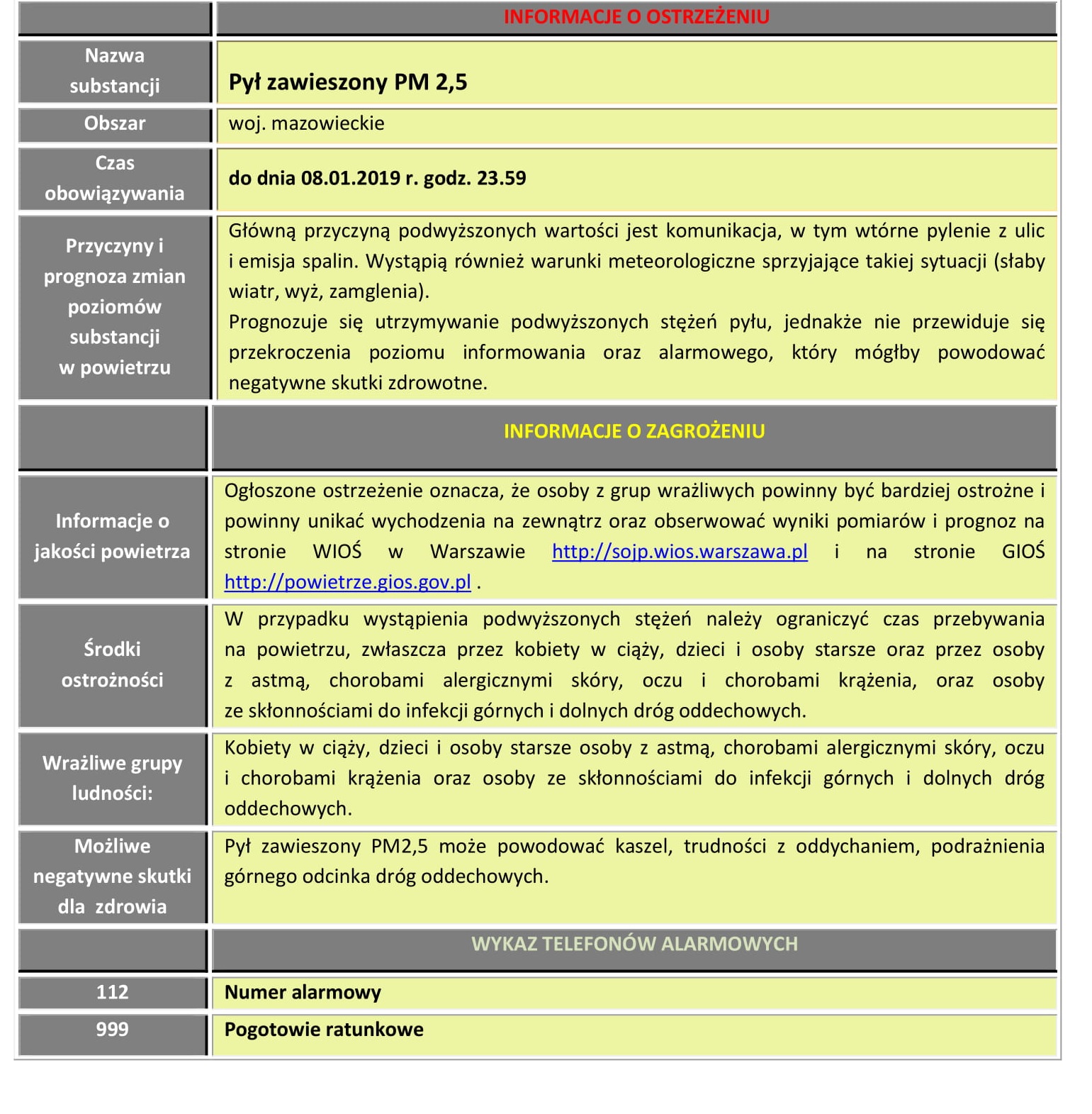 W związku z przekroczeniem w 2019 r. poziomu III – Ostrzeżenia I stopnia o złej jakości powietrza (kolor żółty) dla pyłu zawieszonego PM 2,5 w powietrzu na obszarze woj. mazowieckiego Wojewódzkie Centrum Zarządzania Kryzysowego ogłasza ostrzeżenie I stopnia