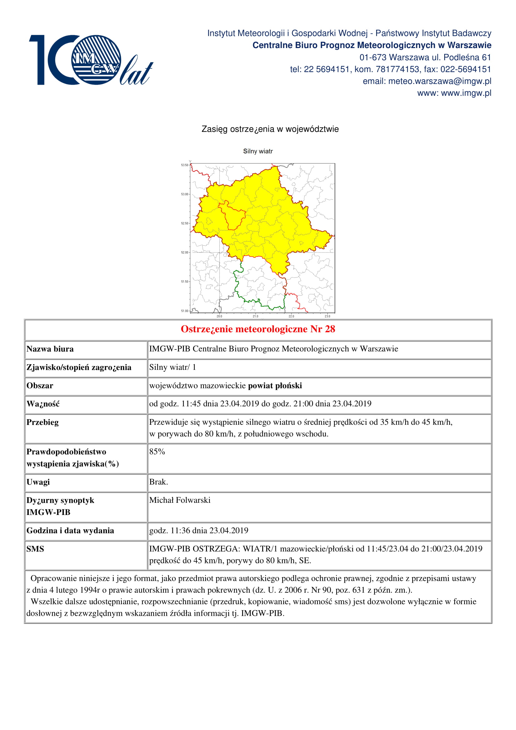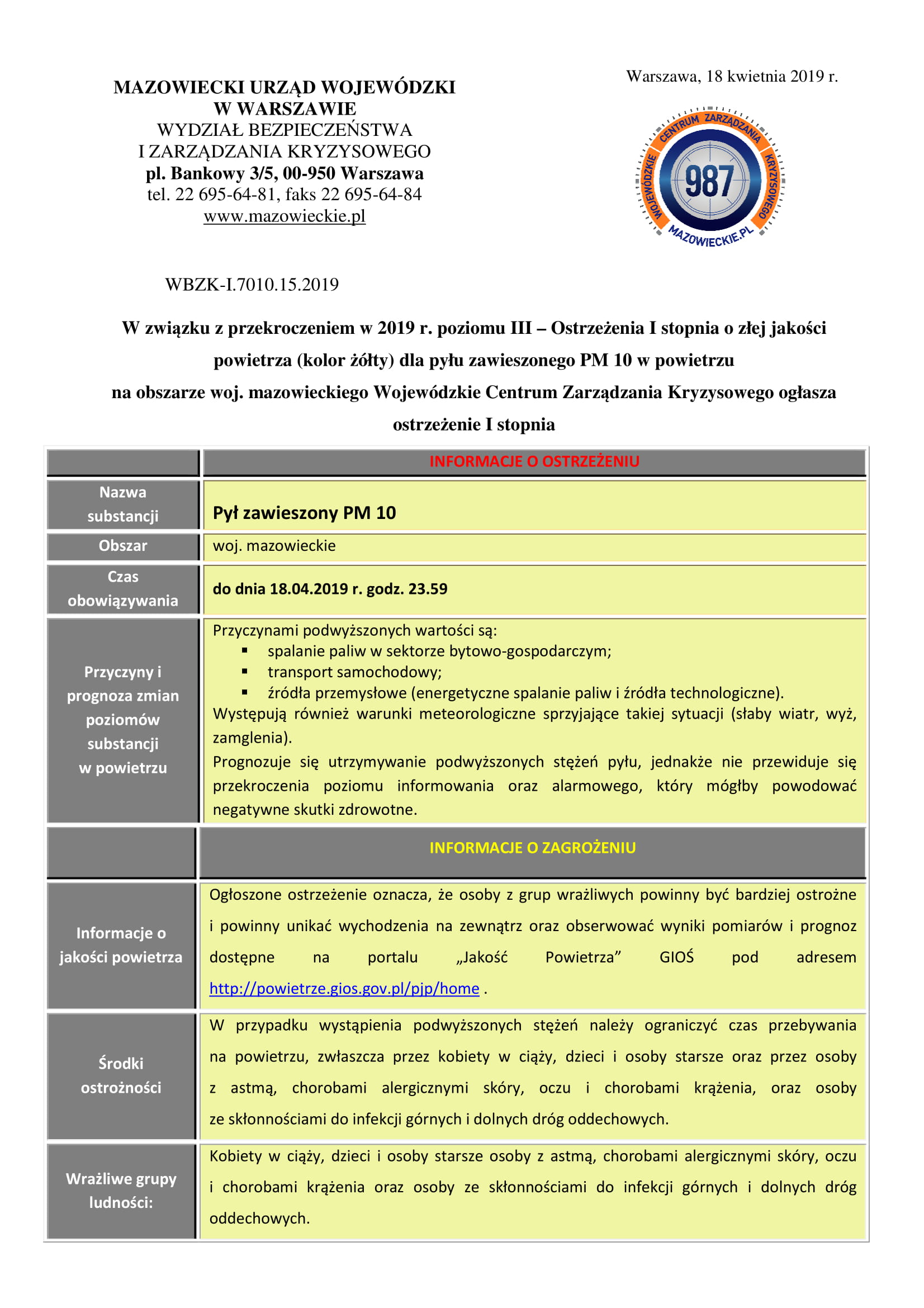Mazowiecki Urząd Wojewódzki w Warszawie wydał ostrzeżenie