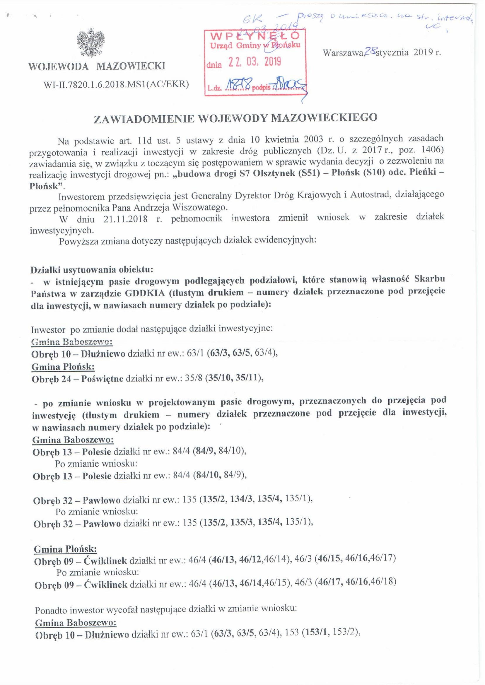 Zawiadomienie Wojewody Mazowieckiego ws. budowy drogi S7 Olsztynek (S51) - Płońsk (S10) - odc. Pieńki - Płońsk