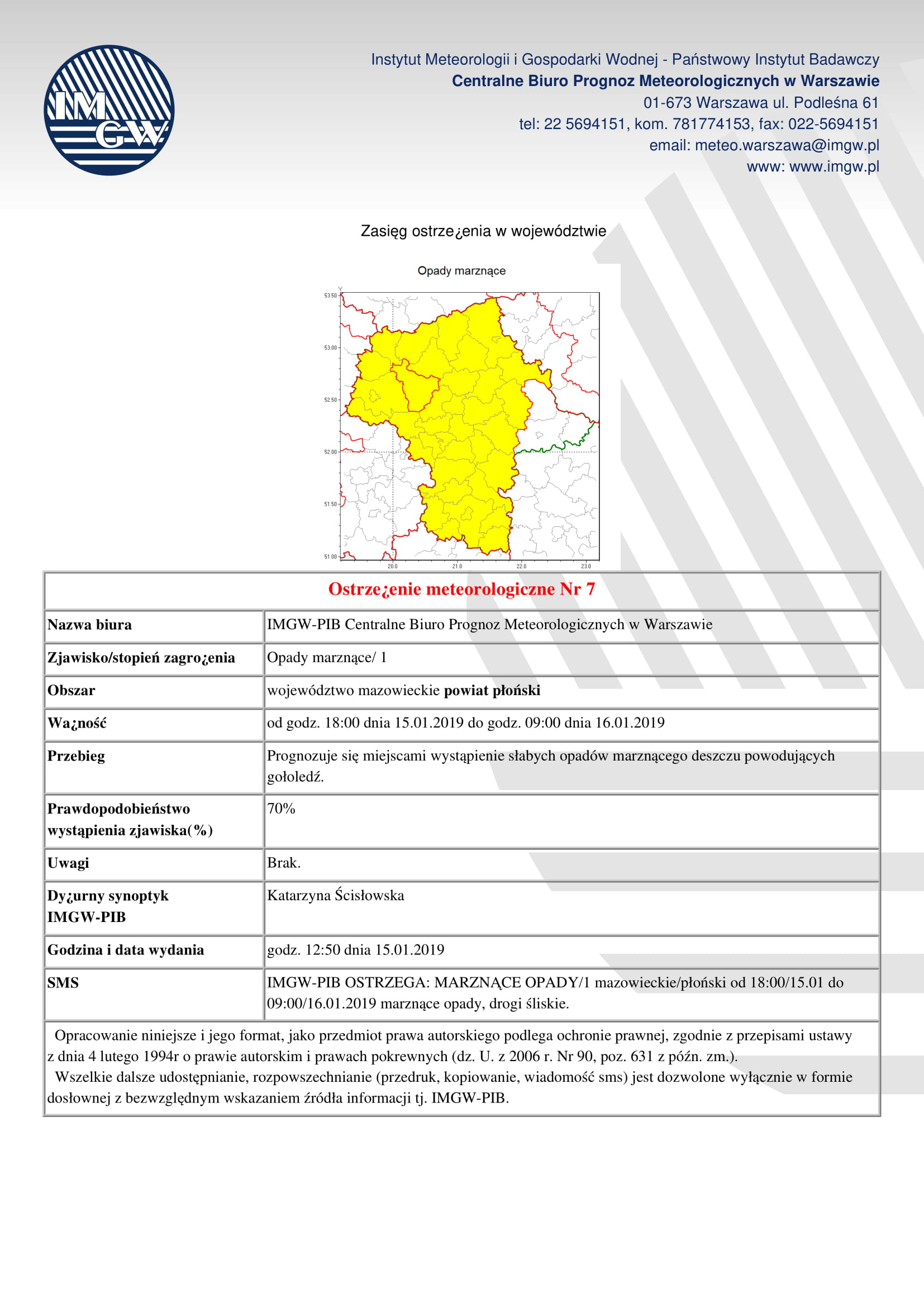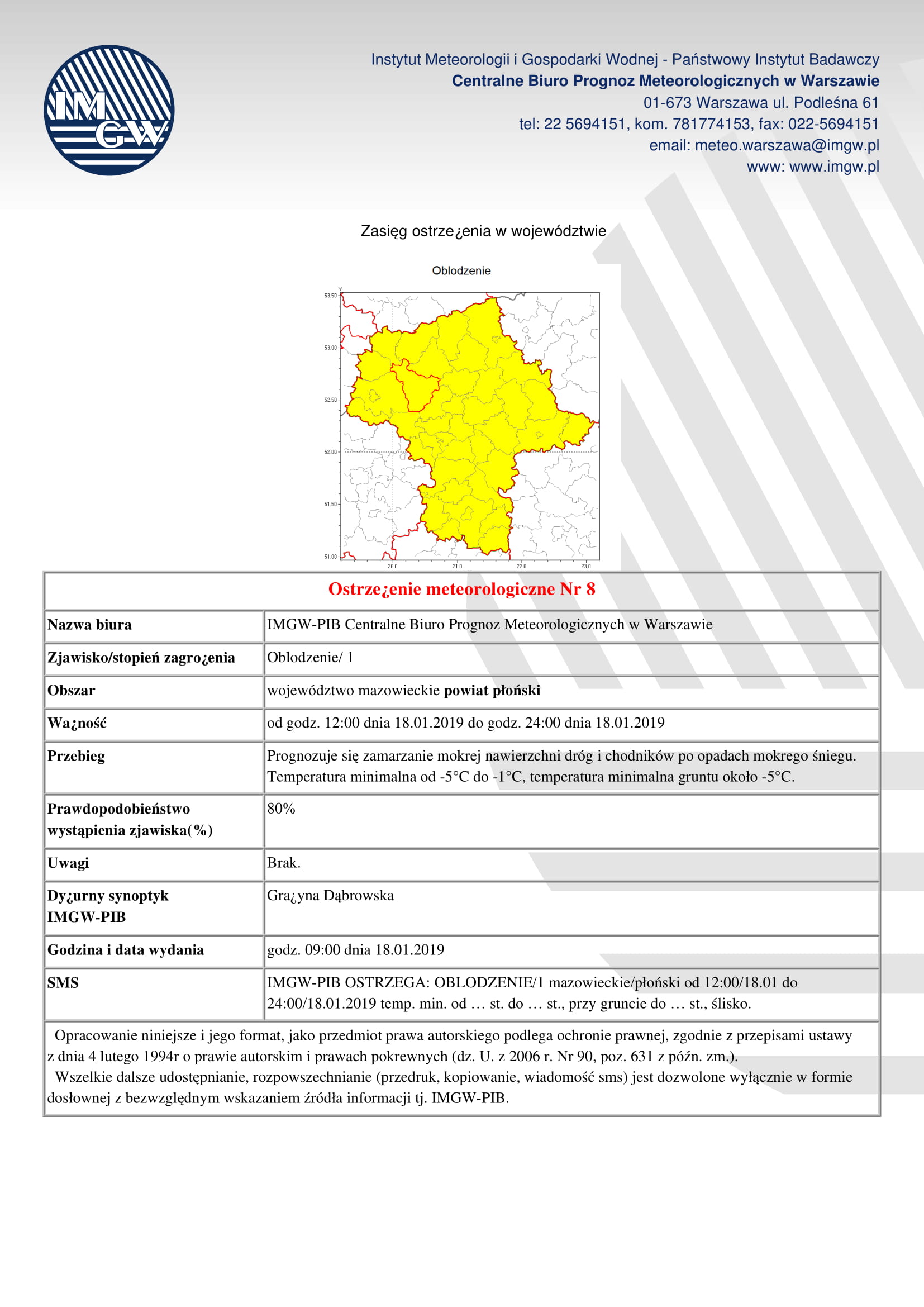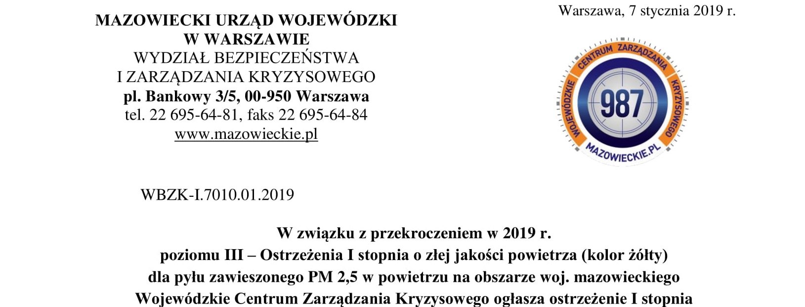 Napisano przez: Urząd Gminy PłońskW związku z przekroczeniem w 2019 r. poziomu III – Ostrzeżenia I stopnia o złej jakości powietrza (kolor żółty) dla pyłu zawieszonego PM 2,5 w powietrzu na obszarze woj. mazowieckiego Wojewódzkie Centrum Zarządzania Kryzysowego ogłasza ostrzeżenie I stopnia