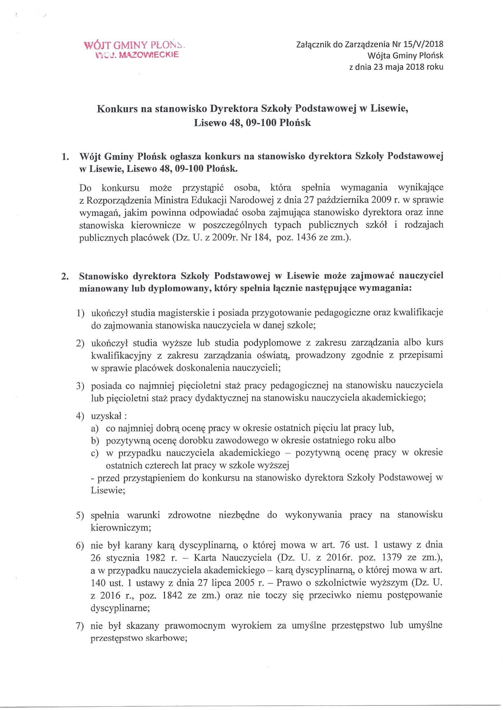 Ogłoszenie o konkursie na stanowisko Dyrektora Szkoły Podstawowej w Lisewie