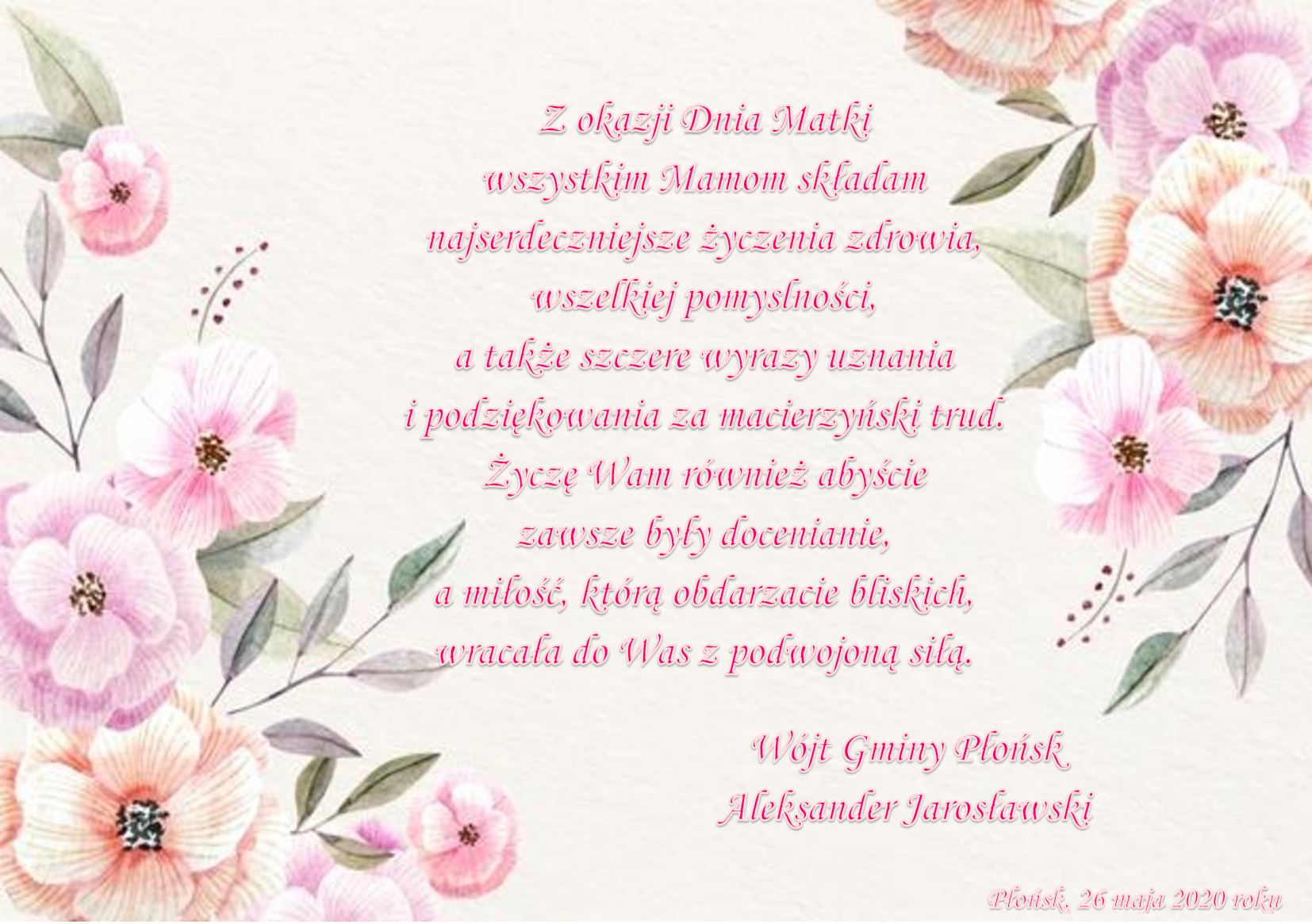 Życzenia od Wójta Gminy Płońsk Aleksandra Jarosławskiego z okazji Dnia Matki (26.05.2020 r.)