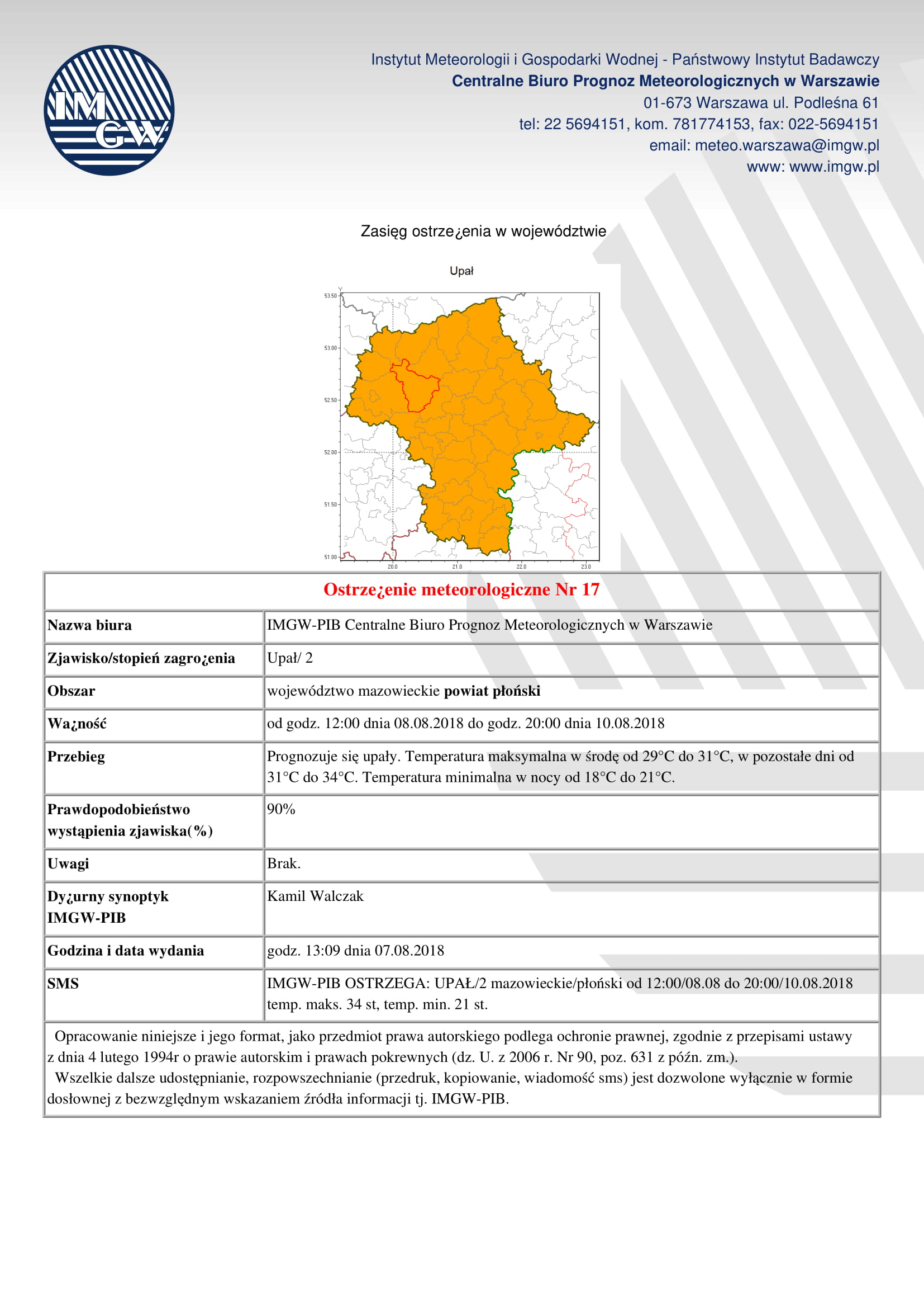 Ostrzeżenie meteorologiczne! 08.08.2018 r. (środa)