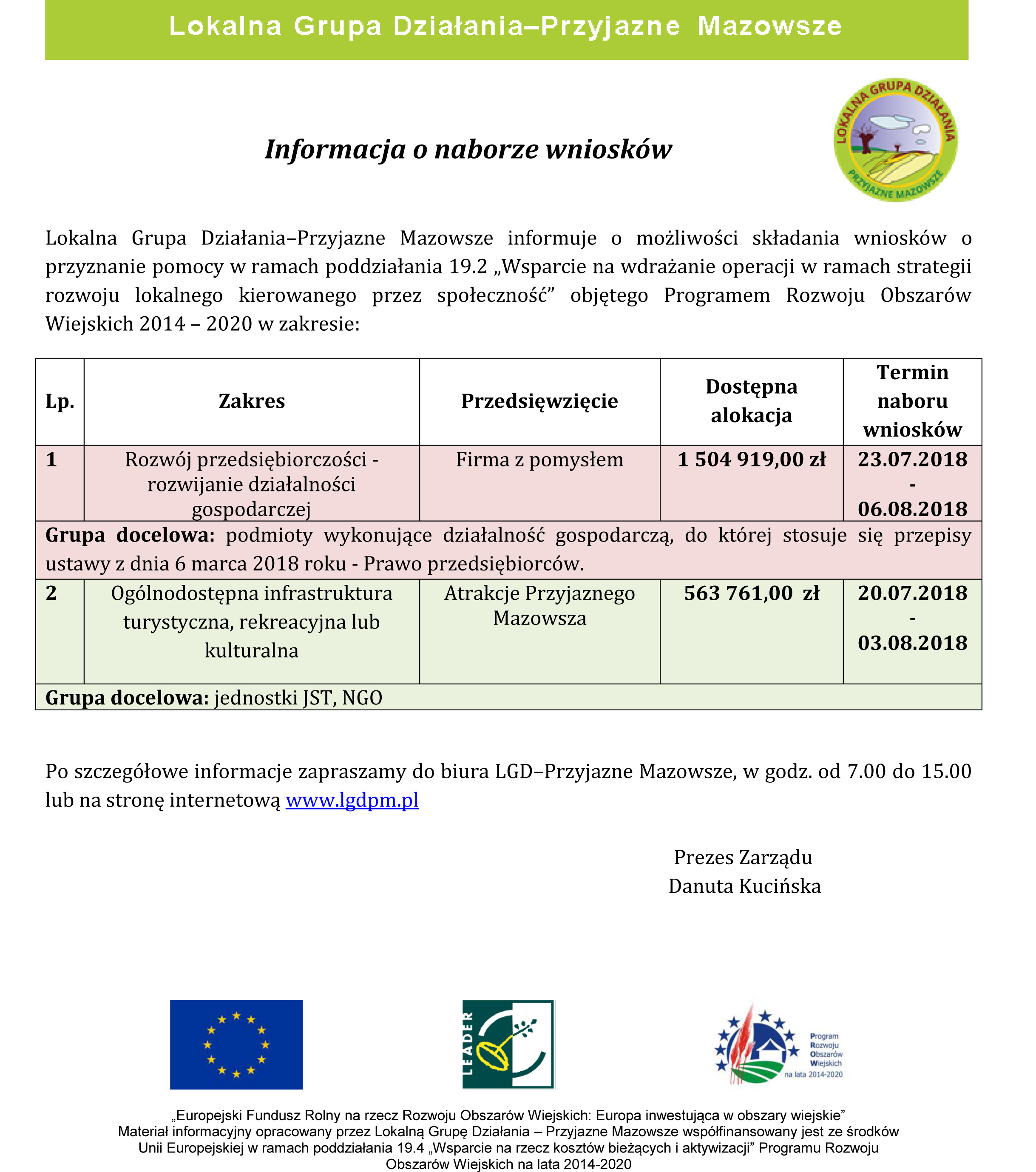 Napisano przez: Urząd Gminy PłońskPo szczegółowe informacje zapraszamy do biura LGD–Przyjazne Mazowsze, w godz. od 7.00 do 15.00 lub na stronę internetową www.lgdpm.pl