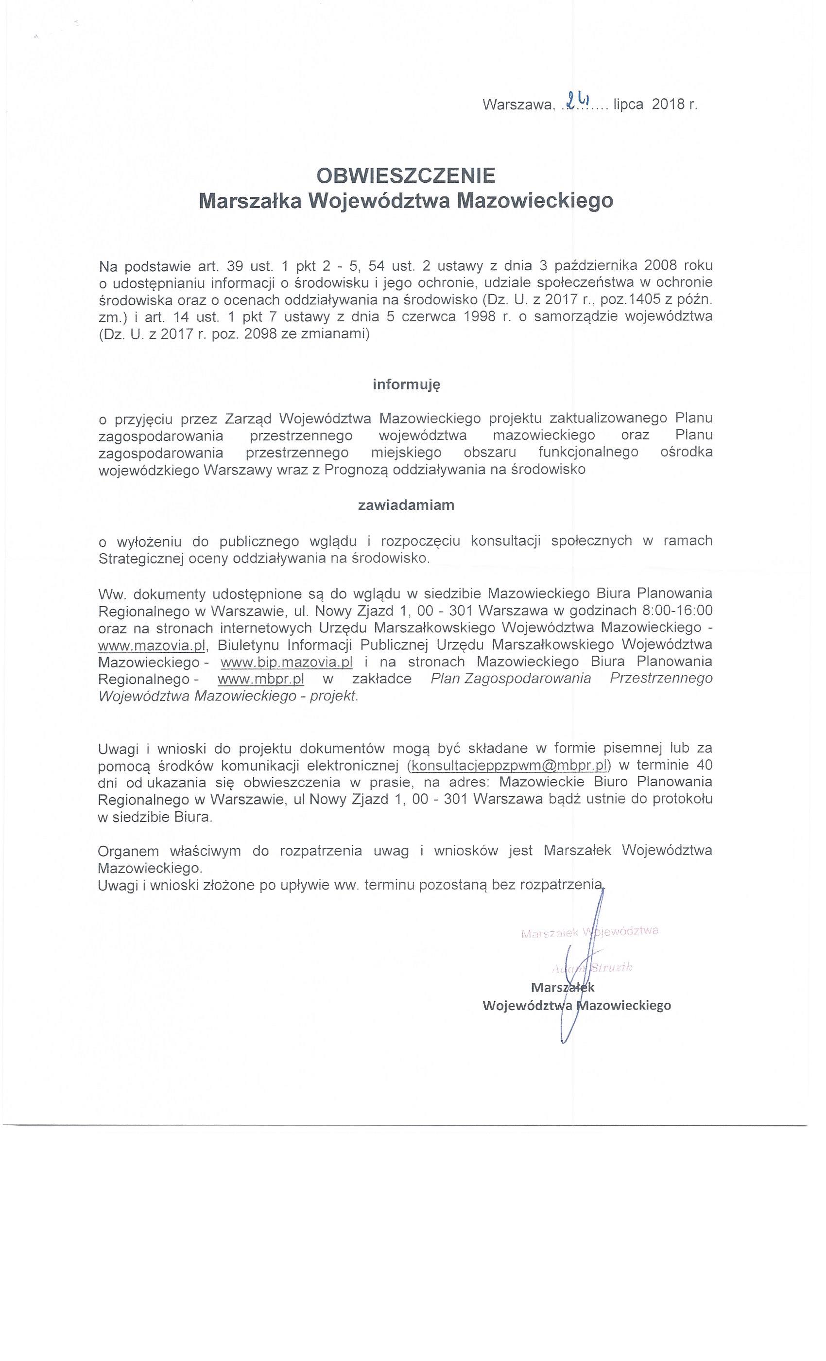 Obwieszczenie Marszałaka Wójewództwa Mazowieckiego