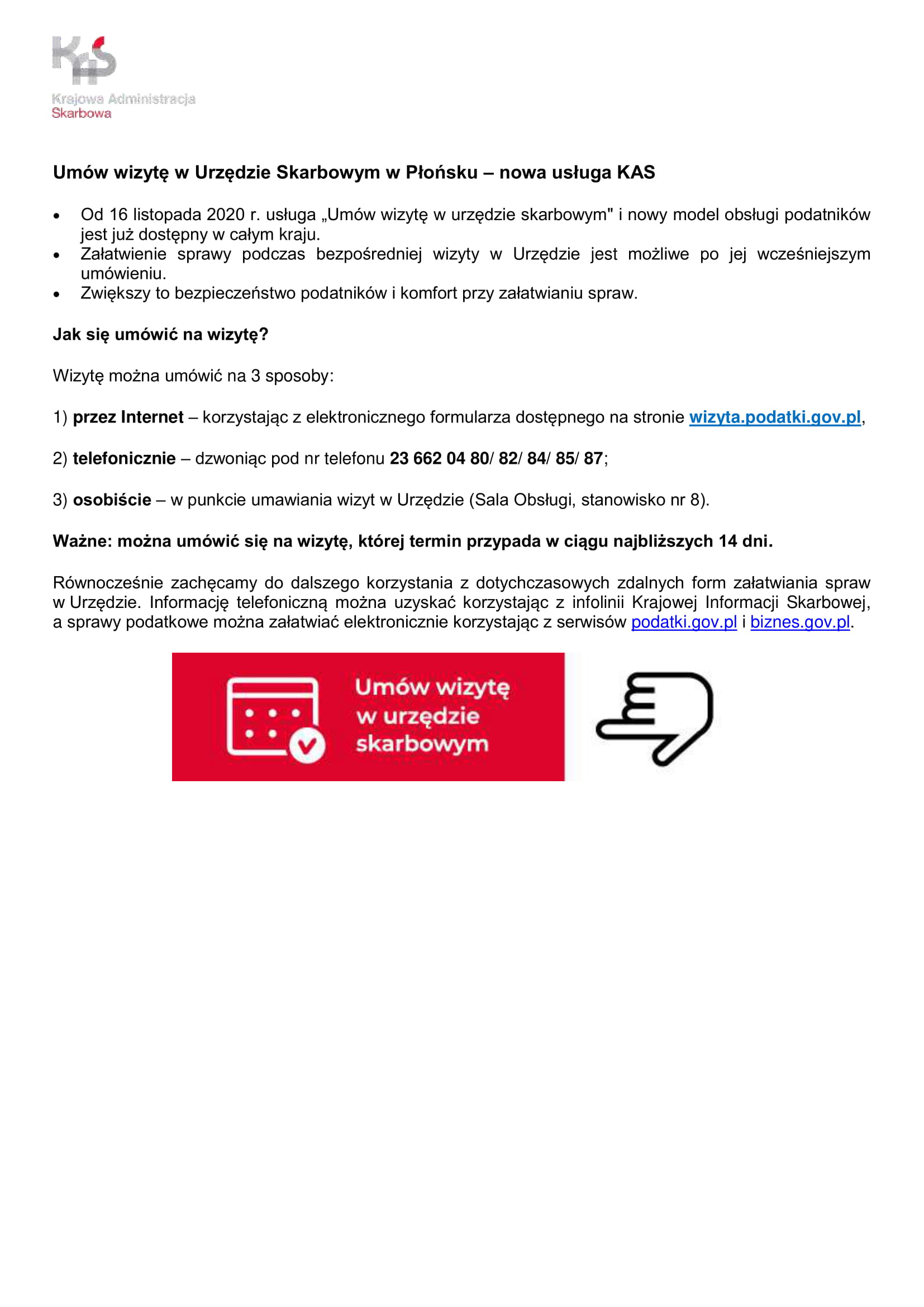 Umów wizytę w Urzędzie Skarbowym w Płońsku – nowa usługa KAS Od 16 listopada 2020 r. usługa „Umów wizytę w urzędzie skarbowym" i nowy model obsługi podatników jest już dostępny w całym kraju.